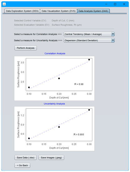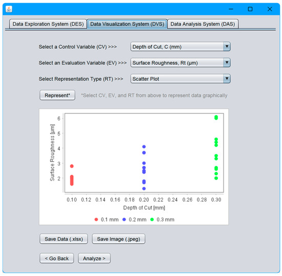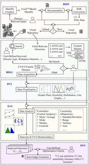 First, the DPS must prepare contents to be included in BD. The contents may exhibit the characteristics of the so-called Digital Manufacturing Commons (DMCs). Thus, it is desirable that the system supports user-defined ontologies and produces widely acceptable digital datasets using Extensible Markup Language (XML) or any other human/machine-readable format (e.g., JSON). The DES can extract relevant datasets prepared by the first system. The system uses keywords derived from the names of manufacturing processes, materials, and analysis- or experiment-relevant phrases (e.g., design of experiment). The third system (DVS) can help visualize relevant datasets extracted by the second system (DES) using suitable methods (e.g., scatter plots and possibility distributions). The fourth system (DAS) must establish relationships among the relevant CV (control variables that can be adjusted as needed) and EV (evaluation variables that measure the performance of a process) combinations for a given situation. In addition, it must quantify the uncertainty in the relationships. Finally, the last system (KES) can extract knowledge from the outcomes of the fourth system (DAS) using user-defined criteria (e.g., minimize surface roughness, maximize material removal rate, etc.). In addition, JAVA™- and spreadsheet-based systems are developed to realize the proposed integrated systems.