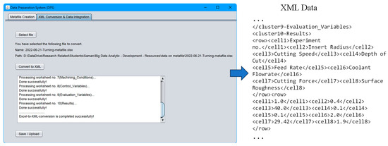 Now, consider the XML Conversion and Data Integration module of the DPS. It converts a filled metafile (metafile after documentation) into machine-readable data (here, XML) and integrates the XML into a cloud-based repository. Figure 8 shows one instance of the module. As seen in Figure 8, the module first provides a facility (a button denoted as ‘Select file’ in Figure 8) to select a filled metafile. After conversion, the module provides a facility (a button denoted as ‘Save/Upload’ in Figure 8) to save the XML data on a local repository for future use or upload the XML data to a cloud-based repository for contributing to the DMC. Whenever the user accesses this facility, a separate pop-up window appears (not shown in Figure 8) from which the user chooses the appropriate options, i.e., Save/Upload. When ‘Upload’ is chosen, the module activates an access token, connects to a cloud-based repository using the token, and uploads the XML data to the repository. This way, users from different workspaces may create the DMC and process-relevant BD for different manufacturing processes, utilizing the DPS as mentioned above.