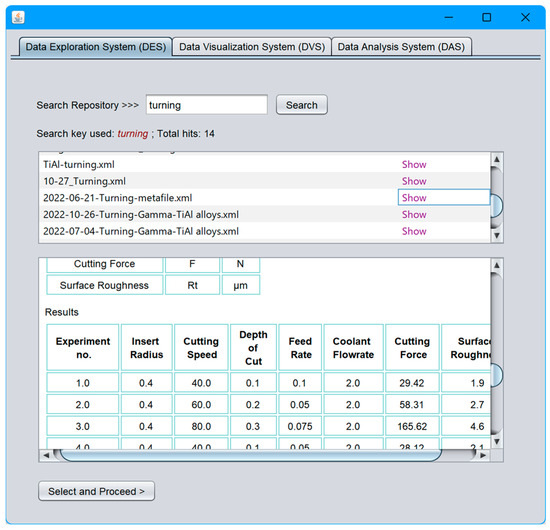 As seen in Figure 9, the DES first provides a user-defined search facility, where a user may define a process-relevant search key, such as process type, workpiece material, etc. For instance, as shown in Figure 9, the defined search key is ‘turning’, a manufacturing process type. Based on the search key, the DES finds all the relevant XML files from the repository and displays the outcomes as a list. For this, the DES also maintains a connection with the repository, just like the XML Conversion and Data Integration module of the DPS. The DES then provides a facility (button denoted as ‘Show’ in Figure 9) to present the search outcomes meaningfully. For this, the DES creates an HTML presentation of the contents underlying a specific search outcome (XML data) in the embedded window whenever the user accesses the corresponding ‘Show’ button. For example, Figure 9 presents the contents (tool, workpiece, machining conditions, CVs, EVs, CV–EV-centric datasets, etc.) underlying the XML data created in Section 4.1. This presentation helps the user decide whether or not the search outcomes are appropriate for further analysis, per the user’s requirements. Based on the decision, the user can acquire CV–EV-centric datasets from the search outcomes via another DES facility, a button denoted as ‘Select and Proceed’ in Figure 9, or research.