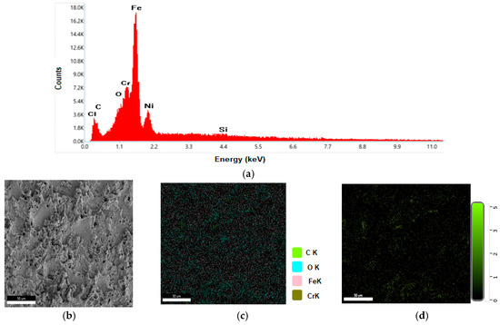 Figure 7 depicts the observation for the SS-304 tool material. Figure 7a shows the EDS plot, and it is clear from the plot that peaks of Fe, Ni, Cr, and Si are observed. The area of material where the EDS plot and elemental mapping were performed is provided in Figure 7b. The combined results of elements are captured in Figure 7c, where the presence of C, O, Fe, and Cr are made. Figure 7d,g shows the mapping for carbon, oxygen, ferrous, and chromium, respectively.