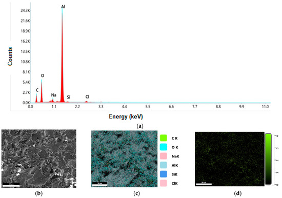 Figure 8 presents the data related to the aluminum material used as an electrode during the processing of Al/SiC/Gr composite. Figure 8a provides the EDS plot, which verifies the presence of aluminum with a peak of it. Other confirmed elements in the material are carbon, oxygen, sodium, silicon, and calcium. The microstructure captured for the analysis of elements is provided in Figure 8b. The elemental mapping of all the elements present in the material is shown in Figure 8c. However, the mapping of individual elements is provided in Figure 8d (carbon), Figure 8e (oxygen), Figure 8f (sodium), Figure 8g (aluminum), Figure 8h (silicon), and Figure 8i (calcium). As this is the elemental mapping of aluminum, Figure 7g shows a great volume of aluminum.