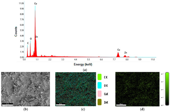 The images captured and their analysis for the brass electrode are provided in Figure 9. The peaks of copper and zinc in Figure 9a verify the brass alloy. The elemental mapping of the brass electrode is made on the area shown in Figure 9b, and the combined results of mapping are shown in Figure 9c. The individual mapping of each element is shown in Figure 9d–g (i.e., for carbon (Figure 9d), oxygen (Figure 9e), copper (Figure 9f), and zinc (Figure 9g)).