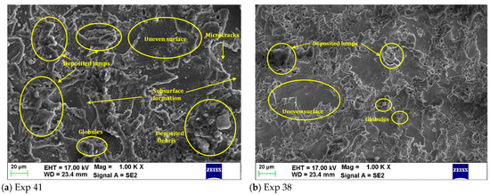 where I: discharge current; Vd: discharge voltage; td: discharge time. The value of current and voltage is provided; however, for the discharge time, the delay time is assumed as zero. Thus, the time becomes equal to the Ton. From Figure 10a, deposited lumps are detected due to the rapid heating and cooling. With the start of the circuit, the temperature in the circuit increases, which melts the material. At the same time, dielectric comes into play, and some of the molten material is deposited in the form of lumps, and some of the material is deposited in the form of debris. The main reason for the microcracks in the EDM process is the development of thermal stresses, which develop during the thermal gradient on the machined surface. Figure 10b shows a significant reduction in the surface irregularities. This is due to the combination of process parameters (Ton: 60 µs; Toff: 60 µs; SV:6 V; I: 10 A; tool: copper) on which the material is machined. As compared to experiment number 41, in the present experiment number (38), the Toff value is increased, SV is decreased, and current is decreased. Hence, the level of DE at this parametric setting is decreased, due to which the crater size decreases and improves the surface quality (2.51 µm).