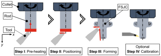 The first substep in the production of the FSJCs is the friction-induced preheating of the steel round bar through frictional contact of the rotating round bar with the KX 40 carbide tool, containing 9 wt% cobalt (Co) and 91 wt% tungsten carbide (WC). The contact surface of the carbide tool consists of a cylinder with a diameter of d = 3 mm and a tip radius of r = 1.5 mm. To produce a wide variety of geometries, the carbide tool is attached to a cross support, which allows the tool to be moved continuously to the x and y coordinates shown in Figure 1. After heating the round bar section, the tool is briefly positioned before the desired geometry of the FSJC is formed based on a path curve. For all investigations, the forming process takes place at a constant bar rotational speed of n = 12,000 rpm and a feed rate of f = 50 mm/min. In the final process step, a conventional turning process is used to eliminate minor geometric deviations in the diameter of the FSJC produced and to set a uniform diameter of d1 = 5.5 mm.