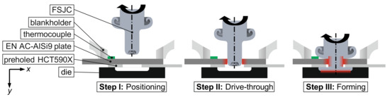 In the investigations, two sheets of different material (length in each case l = 105 mm and width b = 45 mm) are joined with the previously produced FSJC in the second process stage. The sheets overlap by Δl = 16 mm, and the joint is positioned centrally. With the multiphase steel HCT590X and the aluminium cast sheet of the alloy AlSi9, which is produced by sand casting, two sheets with very different strengths are combined. Due to the significantly higher strength of the steel sheet, a pre-hole with a diameter of d = 6 mm is provided in advance of the joining process. In the joining process, the FSJC-side aluminium cast sheet, which has no pre-hole (analogous to flow drilling), is driven through (see Figure 2). The FSJC produced in the previous process step from the round bar of the steel material C45e has a significantly higher mechanical and temperature strength compared to the aluminium cast plate. This allows the aluminium cast plate to be driven through, which avoids the need for a pre-drill hole. When the FSJC is driven through the cast aluminium plate, heat is generated, which is used to reduce the flow stress of the cast aluminium plate and, thus, to reduce the process forces as well as the tool loads. The FSJC, which is heated by the drive-through, continues in the negative y-direction so that it subsequently comes into frictional contact with the matrix underneath, which leads to further strong frictional heat generation. The material volume of the FSJC, which is also reduced in its strength by this frictional contact, flows laterally and fills the die completely, forming the closing head necessary for the high strength of the joint. After reaching the end position, both the feed and the rotation speed are stopped, and the joint is removed.