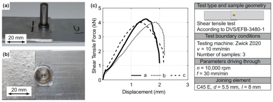 Costas et al. [23] investigated the influence of a pre-hole on the joint strength and the failure behaviour of flow-drill screw connections [23]. This thermomechanical joining method enables the joining of different material pairs based on one-sided accessibility [24,25]. The central result of the investigations from Costas et al. is the fact that a pre-hole under shear load reduces the joint strength but significantly increases the ductility. Despite the good properties of the joints produced, flow-drill screwing still has the disadvantage that mainly thick sheets can be joined due to the need to insert a thread [23].