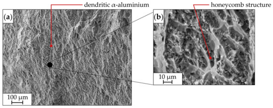 Figure 7 highlights a fracture surface of the AlSi9. On the left side in (a), the dendritic solidification morphology of AlSi9 can be seen in the fracture surface. The right figure (b) shows the 1000× magnification of the marked dendritic structure. In this magnification, it can be seen that the fracture surface has a honeycomb structure. This indicates that ductile failure has occurred in the specimen. Such ductile failure behaviour is caused by the addition of Sr as a refining agent, as shown in Figure 6, because one of the effects is an increase in elongation at fracture. High ductility of the material is important, on the one hand, for the actual joining process to be able to realise high degrees of deformation and, on the other hand, to be able to absorb high energy in later load-bearing capacity tests (see Figure 5).