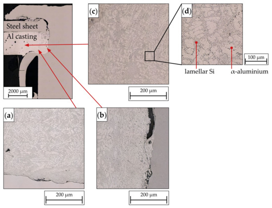 In the scope of the investigations, LM images of the cross-section of the AlSi9 and HCT590X plates joined using frictional forces were obtained. Figure 8 illustrates such an image. The configuration of the joint was as follows: the steel sheet HCT590X was presented on the die side, while the AlSi9 cast plate was on the punch side. In the forming area of the AlSi9 cast plate, the dendritic microstructure in the die-side edge area (a) exhibited a remarkably fine Si eutectic formation due to partial remelting. Moreover, the joining process led to the formation of dendritic α-aluminium with a distinctive stem-like morphology, which can be seen in the LM image (b). The exemplary image (c) from the middle of the specimen reveals the characteristic microstructure of AlSi9. Here (magnified image (d)), no change due to the thermally induced friction process can be seen, also in comparison with Figure 5. An intriguing aspect of the frictional joining process was the absence of crack initiation in the cast plate, a common issue with conventional mechanical joining methods [35].