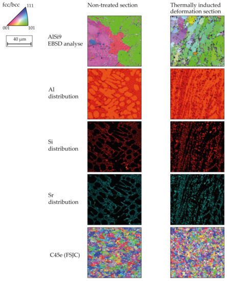 Comparison of EBSD scans of AlSi9 and CK45e in the non-treated section as well as in the thermally induced deformation section. The magnified image of Figure 5 from the authors’ previous study by Borgert et al. [28] is supplemented by EDX scans of the elements Al, Si, and Sr.