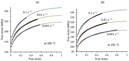 Experimental and predicted flow curves obtained from the uniaxial tensile tests in the rolling direction at three different strain rates at (a) 200 °C and (b) 250 °C.
