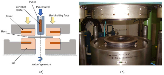 To verify the simulation results with constant friction and variable friction conditions in warm deep drawing, Swift flat-bottomed cup deep drawing tests [28] were performed using 1.15 mm-thick circular blanks of AA5182 alloy using a 50 mm-diameter flat-bottomed cylindrical punch. Blanks of varying diameter from 105 mm to 120 mm were used in the deep drawing experiments at 200 °C and 250 °C. Figure 4a depicts a schematic diagram of the warm deep drawing test setup. The warm deep drawing tests were performed at LFT, FAU Erlangen, Germany. The experimental setup is shown in Figure 4b. The tests were carried out on a servo-hydraulic press at a constant punch speed of 10 mm/s and an initial blank holding pressure of 0.6 MPa. The tools were heated using cartridge heaters embedded in the tools and the blanks were heated in an external oven. To maintain the isothermal condition prior to the tests, the blanks were also heated to the desired temperature by placing them between closed tools for a few seconds. The temperature of the dies and the strip was continuously measured using thermocouples and maintained within ±5 °C of the required temperature during the test. The cups were drawn to a constant depth of 30 mm with SHF 430 as the lubricant. The punch load and the displacement were measured using a load cell and an LVDT, respectively. The limiting draw ratio of the material was predicted by finding the maximum blank diameter that can be drawn successfully.