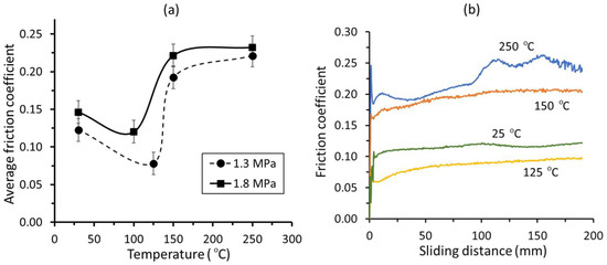 Variation of average friction coefficient with (a) temperature at a drawing speed of 10 mm/s and (b) sliding distance at different temperatures during strip drawing experiments.