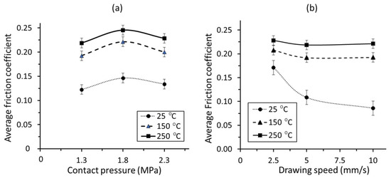 The effect of process variables (contact pressure and drawing speed) on the friction coefficient at two different temperatures (150 °C and 250 °C) is discussed in the following sections.