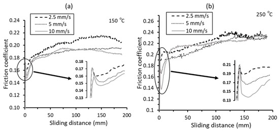 Variation of friction coefficient with sliding distance for different speeds in strip drawing experiments at (a) 150 °C and (b) 250 °C.