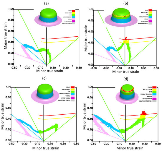 As previously mentioned, finite element (FE) simulations of warm deep drawing of AA5182 employing different friction models have been conducted. The simulation results for cups drawn at 250 °C with initial blank diameters of 105 mm and 110 mm using constant friction coefficient are presented in Figure 9a and b, respectively. The simulations performed considering the variable friction coefficient using blank diameters of 115 mm and 120 mm are shown in Figure 9c and d, respectively. The experimentally determined forming limit diagrams of this alloy at 200 °C and 250 °C by Satish et al. [7] using the Nakazima method have been used as the failure criterion in the simulations.