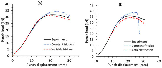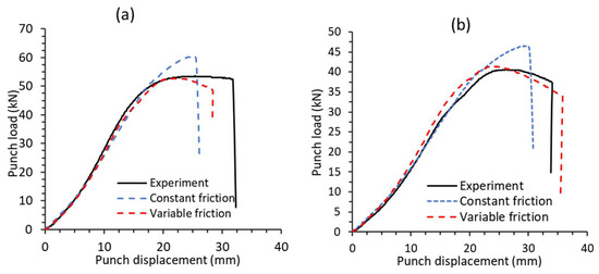 The punch load–displacement curves obtained from the FE simulations for the cups drawn at 250 °C with an initial blank diameter of 105 mm and 110 mm were compared with the experimental results, as shown in Figure 11a and b, respectively. The blank of 105 mm diameter was drawn successfully in simulations using both the friction conditions. With a constant friction coefficient of 0.25 in simulations, a higher peak load is predicted than the variable friction condition. When compared with the experimental values, the error in predicted values is 11% and 3% with constant friction and variable friction, respectively.