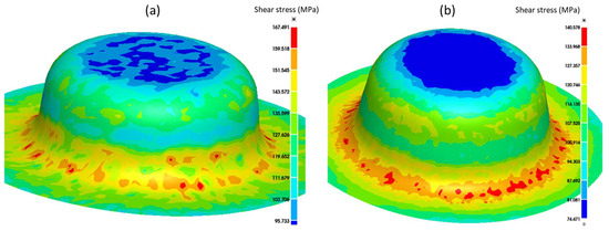 Shear stress distribution from the FE simulation on the cups drawn to a depth of 30 mm at 250 °C using (a) constant friction and (b) variable friction.
