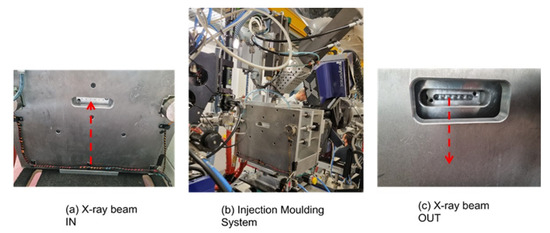The injection moulding unit followed a conventional design with the mould cavity prepared using standard mould plates and mould inserts in an aluminium-silicon alloy, AW6082 [25]. An automatic mechanism for opening and closing the mould cavity was provided using a rail structure. For the injection process, an Industrial Autonomous Injection Unit, UAI6/1OP, from the Rambaldi Group was mounted above the mould. This was an autonomous unit, and the injection stage was all hydraulic [26]. The unit was fitted with a Euromap connection, which made the addition of other components, such as an interface to the ALBA Synchrotron controls, very straightforward. Figure 2a shows the system showing the entry points of the incident X-ray beam, Figure 2c shows the exit ports, and Figure 2b shows the assembled system viewed from the side.