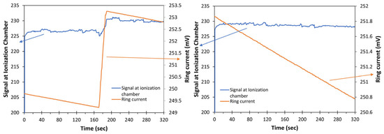Variation in the storage ring current (orange) and the Ionization Chamber signal (blue) during decaying operations (left) and in the topping-up moments (right). The sudden increase in the signals in the first second is associated with the aperture of the fast shutter.