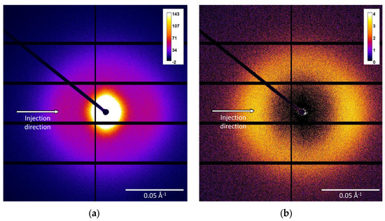 (a) Left, original SAXS pattern acquired during 1 s; and (b) right, the same pattern as before, in which the image collected for an empty mould cavity was subtracted as background.