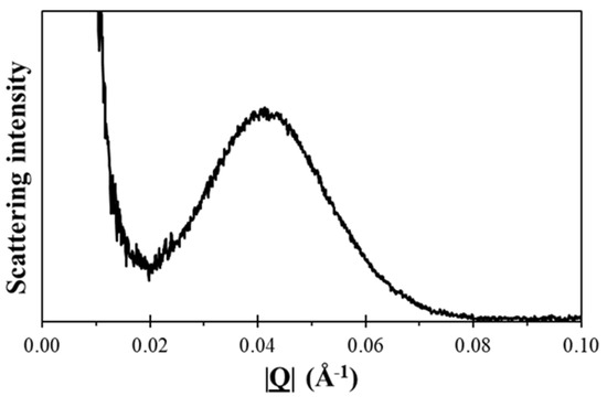 Figure 6 shows the integrated intensity in the image shown in Figure 5b as a function of the modulus of the scattering vector |Q|. This shows an intensity curve typical of the SAXS data from a semicrystalline polymer. The broad peak, centred around a |Q| of 0.043 Å−1, arose from the contrast between the chain-folded lamellar crystals and the intervening amorphous material, which exhibited a lower density. From the data shown in Figure 6, we could obtain a value for the so-called long period Lp, which was the sum of the lamellar thickness and the thickness of the intervening amorphous material. Here, the peak position indicated a value for the long period of 146 Å. From the azimuthal variation in the intensity at a fixed value of |Q|, we can evaluate a measure of the level of preferred orientation.