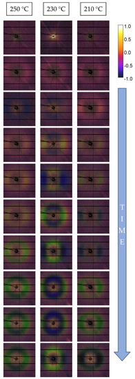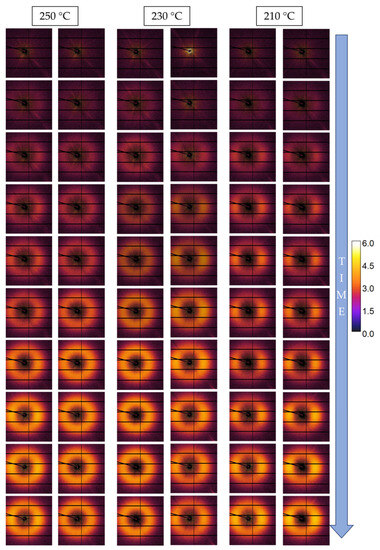 Sequences of 1 s acquisition scans, corresponding to the monitoring of the first window. 1st and 2nd columns: Temperature of molten polymer = 250 °C; 3rd and 4th columns: Temperature of molten polymer = 230 °C; and 5th and 6th columns: Temperature of molten polymer = 210 °C.