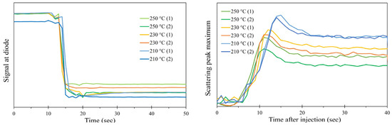 In Figure 9 are reported the variation of the signal at the beamstop photodiode (left) and the increase of the scattering peak after injection. From the plot on the left it’s clearly visible how the injection of the material, inside the mould, produces a change in the transmitted light barely dependent on the different injection. On the other hand, the crystallization degree, correlated to the amount of scattered light, is increased for lower injection temperature.