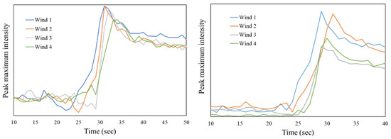 The constraints on the design of the mould cavity limit sampling the SAXS data to one of six predetermined positions, corresponding to the positions in the mould insert where the mould material has been thinned sufficiently to allow adequate transmission of the incident and scattered beams through the mould inserts. Now, of course, the challenge of predetermined positions is that they may not be the ideal position for extracting data or comparing to the predictions of a simulation. We emphasise here that it is straightforward to fabricate an alternative mould insert with optimised positions and install it in an injection moulding system. Here, we report on measurements made using the standard mould insert, in which six windows are distributed evenly along the central line of the mould, with a standard spacing of 11 mm. Figure 12 shows the time-resolved sequences of SAXS data for the first four windows of the mould. Each time sequence starts before the liquid plastic enters the mould cavity. Figure 13 shows the accompanying 1D plots for the time markers and the intensity of the equivalent peak to that shown in Figure 6, but for the images shown in Figure 12 as a function of time. The material is PP1 for the upper block and PP2 for the lower one; the temperature of the molten polymer was 210 °C, and the mould temperature was 50 °C.