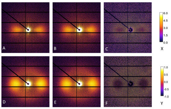 (A,B) Images obtained 1 s and 2 s after injection with their differences, depicted in (C): (D,E) Images obtained 9 s and 10 s after injection with their difference, shown in (F). X represents the colour scale for (A,B,D,E), whereas Y for (C,F) images (enlarged to enhance the readability). It is clear that the majority of the crystallization in the 2nd second exhibits the same highly anisotropic as in the first second), whereas, the crystallisation in the 10th second, there is a modification in the structure towards a more isotropic structure (the “lobes” are darker, whereas the “ring” is lighter).