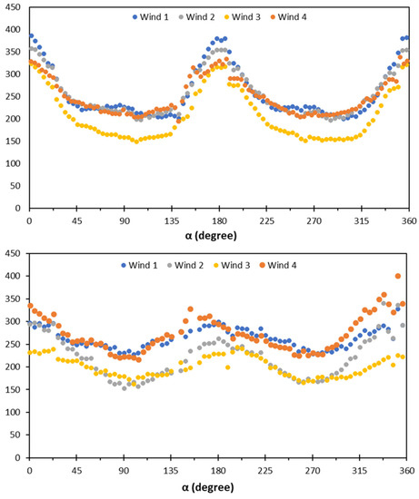 Information of the level of preferred orientation can be obtained from the azimuthal variation in intensity I(α) at a constant value of |Q|. Figure 15 shows the azimuthal variation in the intensity of the lamellar crystal stack scattering (Figure 5b) for SAXS patterns recorded for the injection moulding of PP1, with a polymer melt temperature of 210 °C and a mould temperature of 60 °C for time-equivalent images for the four window positions previously considered. α = 0 is defined as parallel to the flow direction, which is horizontal in the SAXS patterns recorded in this work. Mitchell and co-workers have developed and used a robust mathematical methodology to evaluate the anisotropy from X-ray scattering data [29,30,31]. The basic method is encapsulated in the equations below: