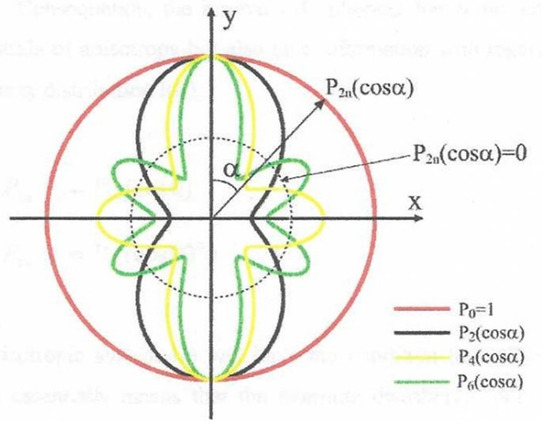 where P2n(cosα) are a series of Legendre Polynomials. In this work, only the even orders are required, due to the inversion centre in the scattering pattern for a weakly absorbing sample, such as the hydrocarbon-based polymers used. Equation (3) identifies the fraction of the shape of the intensity (I|Q|,α) in polar coordinates, with each of the harmonic functions shown in Figure 16, and then scaling that with the scattering for a perfectly aligned system.