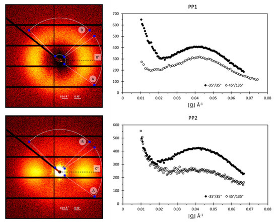 Radial integration over a selected range of angles. Left diagrams visualize a schematic representation of the azimuthal integration ranges superimposed on the SAXS pattern, on which the integration was applied, A being the range −30°/30°, and B being 45°/135°. On the right, the resulting profiles of the integration are shown. Top images correspond to PP1, whereas PP2 results are in the bottom line.