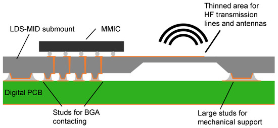 As shown in Figure 1, the basic design concept idea for future mmWave LDS-MIDs submounts combines a printed circuit board for digital signal processing and an LDS-MID for the analog RF circuitry. The signal-generating MMIC is soldered onto the LDS-MID. The majority of its contacts are connected to the PCB via an array of metalized polymer studs, which is called a polymer stud grid array (PSGA). Outside this PSGA, the LDS-MID is electrically contacted and mechanically fixed to the PCB via additional larger polymer studs. To transport the high-frequency signals ideally on the LDS-MID, wall thicknesses are reduced locally. These thinned areas can also provide optimization possibilities for microstrip patch antennas.
