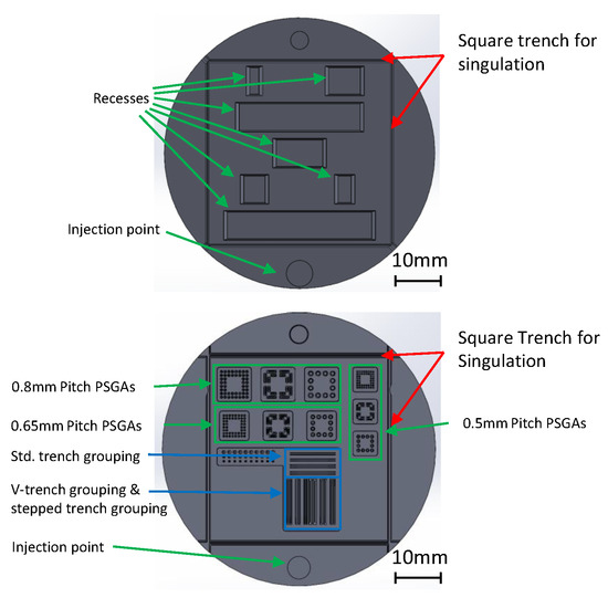 PSGAs were first introduced by [27,28,29,30,31] and could be used to contact LDS-MIDs on printed circuit boards. This concept has already been investigated in [32] but with larger pitches. The PSGAs in this work are adapted to typical BGA (ball grid array) pitches. Pitches of 0.8 mm, 0.65 mm, and 0.5 mm were used. In addition, arrays with double pitches (1.6 mm, 1.3 mm, and 1.0 mm) and arrays with elongated studs were included. The arrays with BGA pitches could be used to rewire an MMIC with BGA to a PCB without changing the BGA pitch. The larger arrays, on the other hand, could support and contact the LDS-MID submount outside the PSGA area. The dimensions of all PSGA arrays are shown in Table 1. Both disc designs contain a molded square trench of 40 mm for singulation.