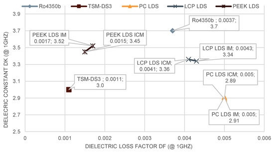 The results of dielectric measurements performed on IM and ICM substrates of PC LDS, LCP LDS, and PEEK LDS using the 16453A Test Fixture and Keysight E4991A Impedance/Materials Analyzer are depicted in Figure 4. It shows the dielectric properties for the 1 GHz frequency point. In addition, datasheet values of the two RF PCB materials Ro4350b and TSM-DS3 are also plotted for reference. The amorphous PC LDS shows little change in dielectric constant (DK) or dissipation factor (Df). PEEK LDS and LCP LDS show a slightly larger variation. However, these variations are still within the range of the measurement inaccuracies of the measurement system [34].