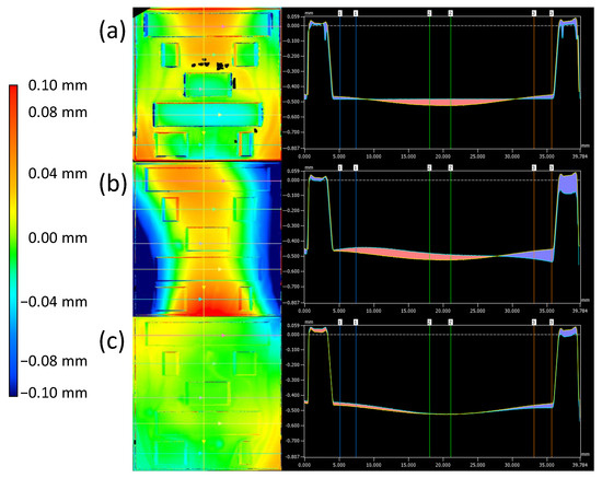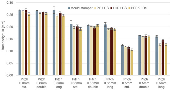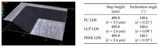 The replication accuracy for all three LDS-MID materials investigated is shown in Figure 5. The mean values are 480.8 µm ( = 3.3 µm) for PC LDS substrates and 485.8 µm ( = 2.4 µm) and 489.8 µm ( = 2.4 µm) for LCP LDS substrates and PEEK LDS substrates, respectively. The differences in the mean values are presumably caused by the different melt and mold temperatures and the different coefficients of thermal expansion of the LDS-MID substrates. The angles of the ramps agree with each other with deviations of less than 1. These results prove high replication accuracy (Figure 5).