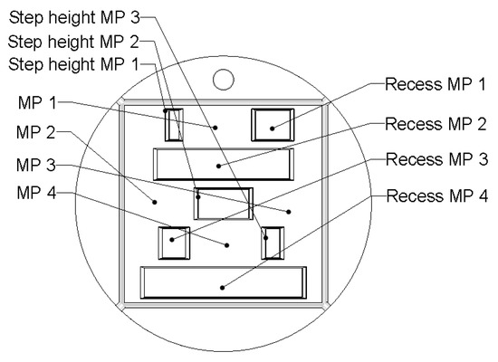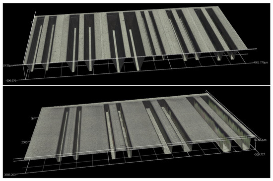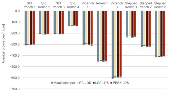 The depths of the molded trenches were measured on 10 substrates per LDS-MID material. A 3D profilometer was used. The trenches are divided into three groups. The first is a group of four by two trenches with almost perpendicular sides. They are only tapered by an angle of about five degrees to improve demolding. The second group consists of three by two V-shaped trenches with an angle of about 65 for the inclinations. The third group consists of a combination of the shapes from groups one and two. In the upper part, these trenches have a slope of 65, while the lower halves of the trenches have an angle of 5, as do the trenches from group one (Figure 13).