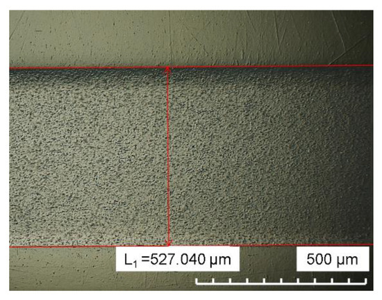 The wall thickness was measured at four measuring points (MP) in the thick part of the plate and at four measuring points in the recesses (recess MP 1) on a total of five substrates per LDS-MID material. The measurement positions and the results are shown in Figure 6 and Figure 7. PC LDS shows the smallest wall thickness of about 915 µm, which is followed by PEEK LDS and LCP LDS with 980 µm and 1015 µm, respectively. The wall thickness in one of the larger cavities was checked on PEEK LDS by microscopic measurement of a cross-section (Figure 8). The value of approx. 527 µm measured with an optical microscope agrees with the values measured mechanically of approx. 520–530 µm in the recesses.