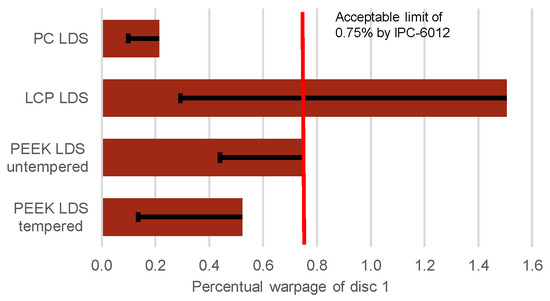 Maximal warpage of TRL-type LDS-MID substrates from PC LDS, LCP LDS and PEEK LDS. The error bars indicate the minimal warpage of all measured LDS-MID substrates.