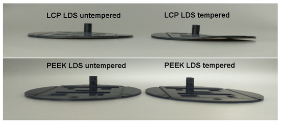 While the local replication accuracy of the recess and the homogeneity of the wall thicknesses of the substrates have only low single-digit tolerances, difficulties in ejecting the substrates from the injection mold were apparent during molding of the substrates. Since the mold inserts were not equipped with an anti-stick coating and only included three ejector pins, the parts jammed in the mold and were deformed during ejection, which caused warpage of the parts. This warpage was lowest for PC LDS, which was followed by PEEK LDS. Both materials met the IPC-61012 standard maximum warpage of 0.75% with respect to their edge length of 40 mm after singulation. However, LCP LDS showed a significantly larger warpage of up to 1.5% (Figure 9). To improve the planarity of the substrates, five LCP LDS and PEEK LDS substrates each were subjected to a tempering process in a box oven (2 h at 200 C). While the warpage for PEEK LDS improved significantly (Figure 9), the tempering process for LCP LDS led to an increase in warpage, see Figure 10, and was therefore discarded. Figure 11 shows the effects of the tempering step on PEEK LDS with regard to warpage. Figure 11a shows the deviation of a tempered PEEK LDS substrate from the mold insert. The more prominent sag of the recess in the upper region, near the injection point of disc 1, can be seen. In Figure 11b, the typical deviation from a tempered PEEK LDS substrate to an untempered substrate is illustrated, while Figure 11c shows the deviation between two tempered PEEK LDS substrates, which is significantly lower.