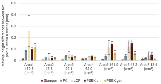 Since the recesses are of particular interest for HF signal routing, the deviations from the ideal form were also measured by means of strip light projection. As shown in Figure 12, the deviations are related to the warpage of the substrate and to the surface to wall thickness ratio of the recesses. Again, PC LDS shows the lowest warpage, which is followed by PEEK LDS tempered and untempered. LCP LDS shows the highest warpage especially in area 1. This is caused by the combination of the strain during the ejection of the disc and the special morphology of the liquid crystal polymer, which resulted in a bending of the disc.