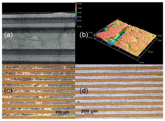 Surface defects on LCP LDS, (a) 3D view of surface displacements, (b) 3D height representation of surface defects in LCP LDS, (c) metallization defects on LCP LDS, and (d) optimal metallization on PEEK LDS.