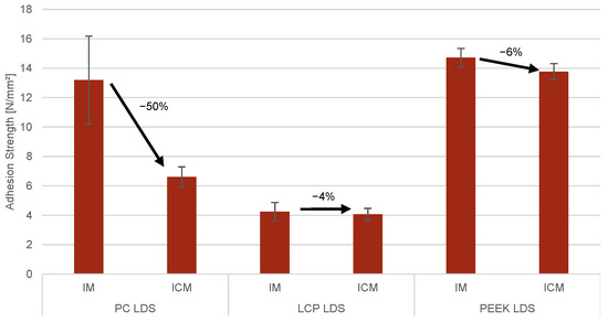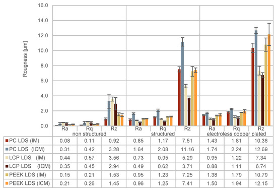 To discuss the roughness, the unstructured ares have to be considered first. The roughness of an injection-molded or injection–compression-molded part is not only dependent on the mold geometry and roughness but also on the material, the design of the runner system, the mold temperatures, and the injection molding parameters. Therefore, it is reasonable that a massive change from one molding tool to another and a significant change in the injection molding process can influence the overall structure and morphology of a molded plastic part. For PC LDS, the roughness changes from Rq = 0.11 µm to Rq = 0.42 µm, and for PEEK LDS, it changes from Rq = 0.21 µm to Rq = 0.26 µm. For LCP, on the other hand, the roughness decreases from Rq = 0.57 µm to Rq = 0.45 µm. The roughness of the structured areas is not only dependent on the laser and the material. Additionally, it depends on the roughness of the molded plastic part itself, as the laser-induced roughness is only added to the existing roughness. However, this relation is not exactly linear and depends on the material properties of the plastic in interaction with the laser parameters. As each material has its own laser parameters, the comparability between materials is limited. Corresponding with the changes of the unstructured areas, the roughness of PC LDS changes from Rq = 1.17 µm to Rq = 2.08 µm, and for PEEK LDS, it changes from Rq = 1.23 µm to Rq = 1.25 µm. The roughness of structured areas on LCP LDS decreases from Rq = 0.95 µm to Rq = 0.62 µm. For the electroless copper plated areas, the roughness changed similarly from Rq = 1.81 µm to Rq = 1.24 µm for PC LDS, and for PEEK LDS, it changed from Rq = 1.79 µm to Rq = 1.94 µm. For LCP, the roughness changed the least from Rq = 1.22 µm to Rq = 1.11 µm.