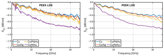 The characterization of the LDS substrates proved that the roughness of the laser patterned IM and ICM substrates differed only slightly. The reason for these slight differences may be the fundamental roughness of the unstructured polymer surface. The adhesion strength of the metal layers for LCP LDS and PEEK LDS hardly changes between both manufacturing processes. Only for PC LDS were the measured adhesion strength differences significant. A possible reason for this could be an observed bending of the substrate during the hot bump pull test caused by the lower mechanical strength of the PC LDS. By placing a downholder right next to the test area, we attempted to negate this effect. While the measured adhesion strength increased from 5.7 to 6.6 N/mm, a bending of the substrate was still observed. The characterization of the TRL kits on PC LDS and PEEK LDS shows comparable performance to the HF PCB substrate material RO4350b. Similar insertion loss values were reported by Friedrich et al. in [49].