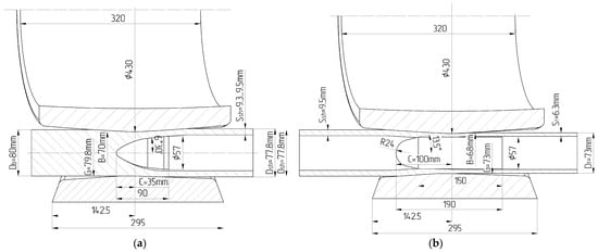 Both phases were carried out with a MISIS-130D pilot mill (Figure 3a). The machine included working rolls, guiding tools, and power supplement sections. The barrel-shaped working rolls of the mill had a biconical gauge with an entry angle of roll cone φ1 = 2.5° and exit angle φ2 = 3°, respectively. The feed angle of the rolls was β = 14°. The gorge of the rolls (zero position of the deformation zone) was at the section of the maximum diameter of the roll. The material of the rolls was steel 45 with roll surface hardness of 200 HB. The rotational speed of the working rolls was set to 57 rpm, similar to those used in industrial processing of other steels. Guide shoes were made of high-nickel cast iron with hardness of 60–62 HRC. For the piercing stage, a plug of a 57 mm diameter with a taper angle of 6.5° was used. For the rolling stage, a cylindrical plug of a 57 mm diameter was used. The material of both mandrels was a high-Ni-based alloy. The temperature of the tool during piercing was equal to the ambient temperature (20–25 °C). The tool was cooled with water between passes. A forged round bar with a diameter of 80 mm and length of 220 mm was used as the incoming billet. A centering recess of 20 mm diameter and 30 mm depth was drilled in the center of the billet head end. Before deformation, billets (bars or shells) were heated in a chamber-type electric resistance furnace up to a temperature of 1170 °C for 60 min and 15 min, respectively. The transportation time of the billets from the furnace to the inlet of the piercing mill was ~8 s.