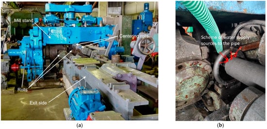 The dimensions of the resulting shells and pipes, the current load on the main drive electric motor, and the process time for piercing and elongation were recorded during the experiment. The wall thickness (WT) was measured at four points within 100 mm away from the pipe head and tail ends. The shell after piercing and the pipe after elongation were subjected to cooling with water at the exit of the pilot mill during the manufacturing process. For that purpose, several nozzles for water supply were installed at the exit of the stand at a distance of ~200 mm from the rolls end (Figure 3b). The time between exiting from the deformation zone and cooling with water was no more than 0.7 s in both stages of the process. The mandrel extraction operation took approximately 15 s in both stages; during this period, the section of interest of the shell/pipe was positioned under the water nozzles to cool down that region rapidly. Then, the pipe/shell was completely immersed in a container with water at a temperature of 20–25 °C. For further research, branch pipes 100 mm long were cut out from the area 100 mm away from the pipe head end, for which the time, temperature, and deformation conditions of rolling and cooling along the length can be considered the same.