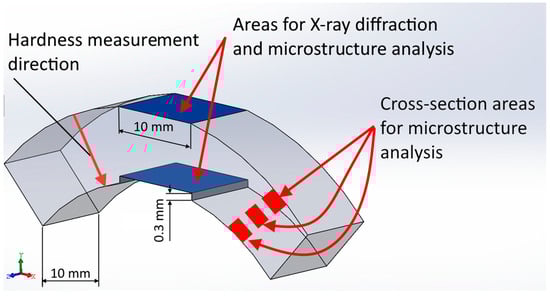 X-ray structural analysis was performed on longitudinal samples using a DRON-8 general-purpose diffractometer. The scanning area corresponded to a distance of no more than 0.3 mm from the internal and external surfaces of the sample (Figure 4). Scanning parameters: radiation—CoKα; measurement range 2θ, from 25 to 120°; voltage, 40 kV; current, 20 mA; scanning step, 0.05°; exposure time, 4 s—discrete mode, processing performed using the PDF-2 database Release 2014 ICDD.