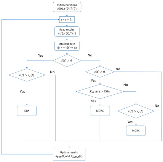 where t is the time interval elapsed since the end of the plastic deformation. The higher the temperature, the greater the strain rate, and the faster the MDRX. The procedure chart implemented in Forge NxT for the determination of the microstructural changes is shown in Figure 5. The macroscopic field variables obtained from the FE simulation were used as the input data for the calculation in that subroutine.
