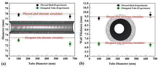 Comparison between simulation and experimental results of (a) tube diameter and (b) wall thickness.