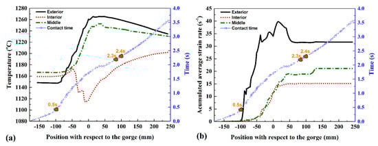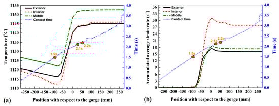 First, the results of the first piercing stage are presented. Measurements were taken at three different points within the section of the shell at the outer, middle, and inner radii. In addition, the times when the material first contacted with the plug, completed its contact with the plug, and completed its contact with the mandrel were provided. The deformation conditions, namely, temperature and strain rate at each of the three points, were recorded and are presented in Figure 9a,b as related to the position in the rolling axial direction, where the gorge was (x = 0).